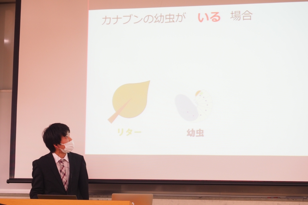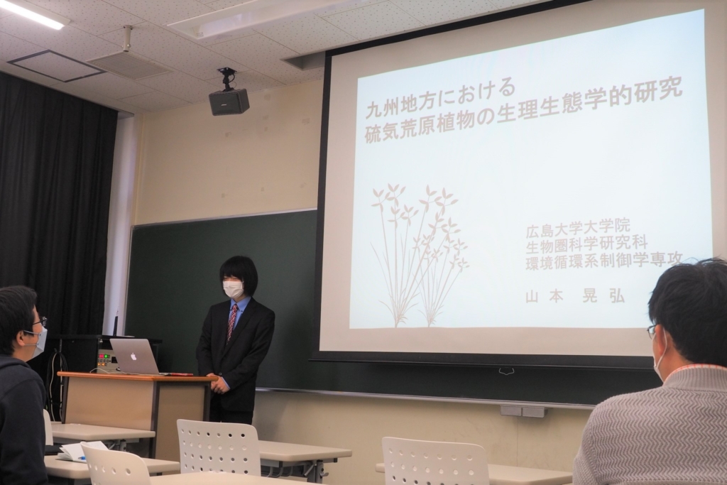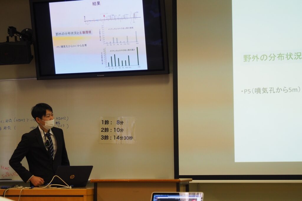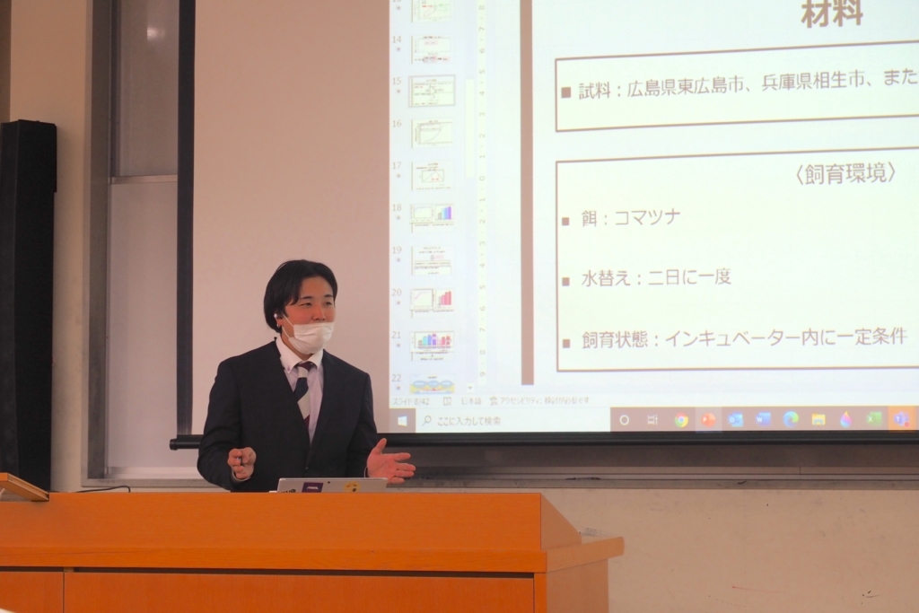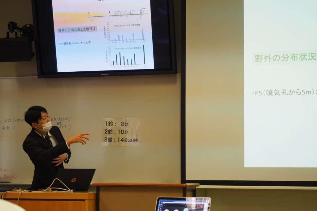 中坪研究室に所属する大崎さん(D3)が「第874回環境科学共同セミナー」で講演されました。演題は「熱帯を起源とする外来草本 Bidens pilosaの侵略性に対する温暖化の影響評価」です。30名ほどの聴者が大崎さんの講演を熱心に聴いていました。(B3 稲葉)